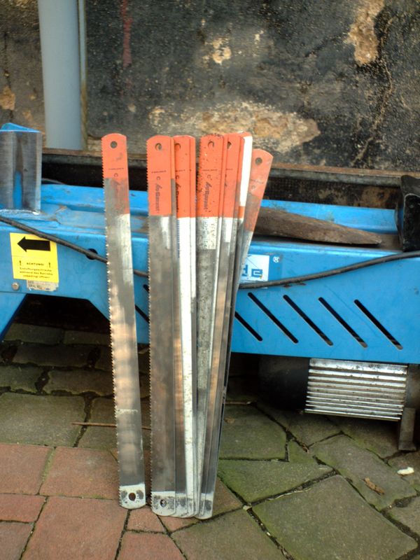 Es gibt auch gerade Maschinensägeblätter, besonders für Metall (gibt's das gleiche auch für Holz?). Die Maschine dazu sieht aus wie eine Motorbetriebene Bügelsäge und steht vor allem in Metallverarbeitenden Betrieben. Der grosse Vorteil von den Dingern ist das sie nur schwer heiss laufen aufgrund der gemütlichen Arbeitsweise.