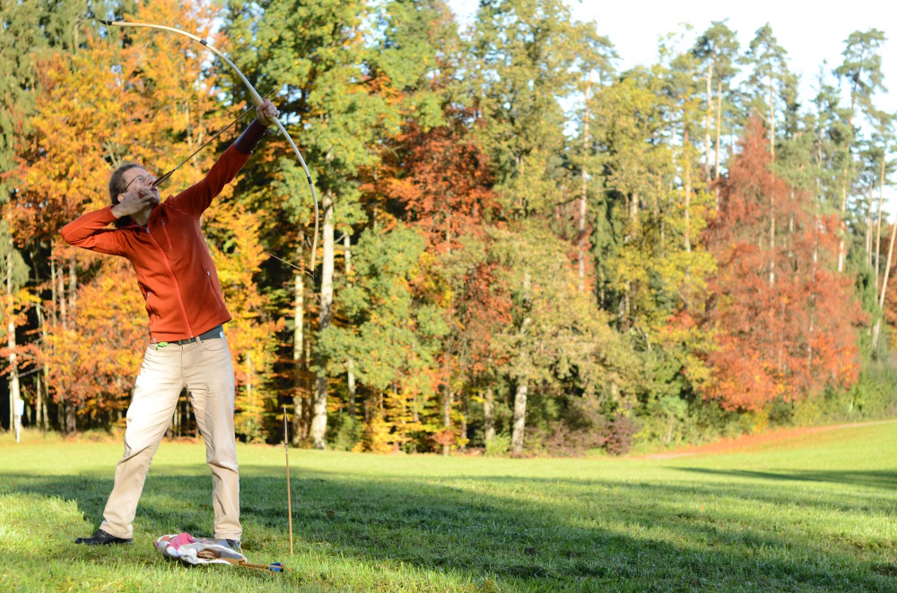 … und hat die Schweiz wohlbehalten erreicht! Sieht toll aus und schiesst auch so! Mein erster Bogen mit Hornnocken. Der Griff ist mit dem dunkleren Hickory-Kernholz zweifarbig. Detailfotos folgen später. Heute Morgen war das Wetter total schön, die Wiese frisch gemäht (danke!), ideal zum Schiessen.