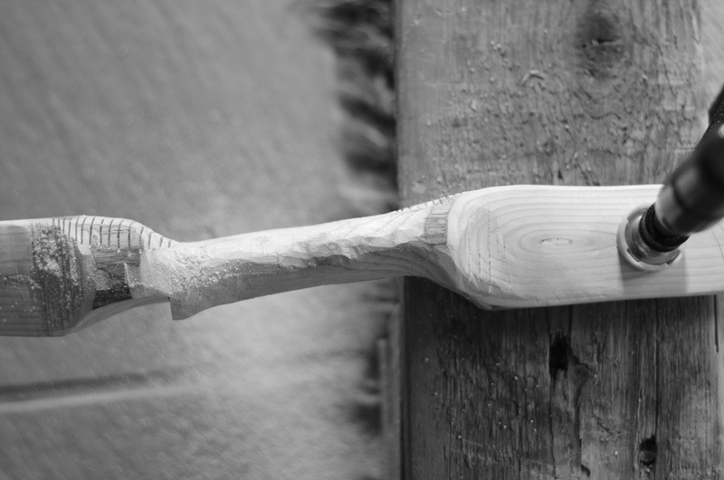 Der Baubeginn war mässig spektakulär, das Wetter noch mässiger und meine Motivation, die Kamera mitzunehmen, nicht vorhanden. Fürs Grobe gings erst mal mit dem Beil zur Sache, was hier nicht ganz so einfach war wegen der Härte und später wegen des Drehwuchses. Ging aber.