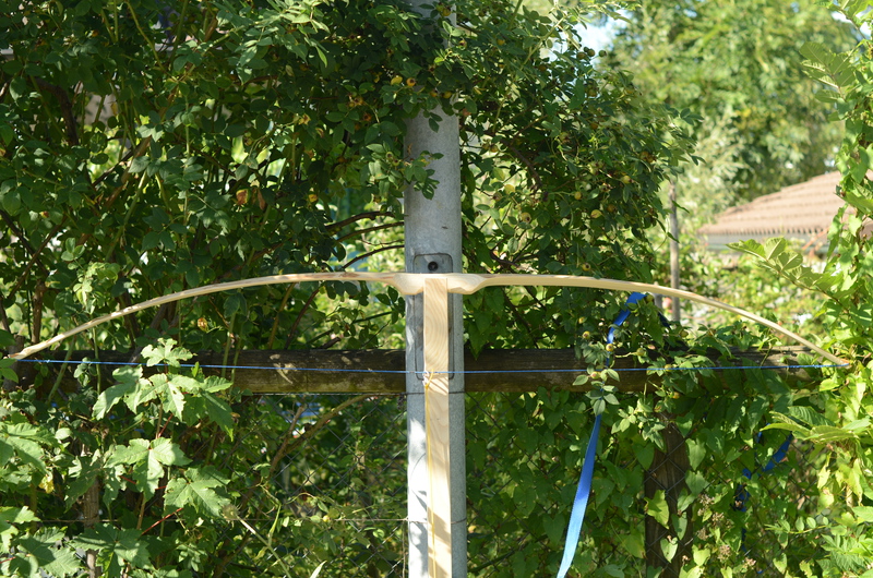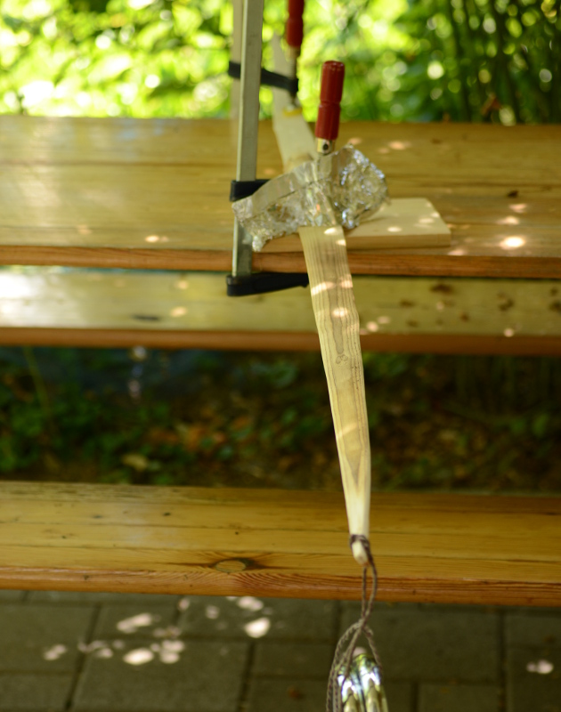 Heute beim Probeschiessen flogen die Pfeile dann auch etwa 20 m weiter. Vor dem Tempern habe ich die Tips noch schmaler gemacht und etwas weiter getillert, dabei wurde der Bogen zwar leichter, aber auch schwächer. Jetzt nach dem Tempern ist er genau so, wie er sein soll.