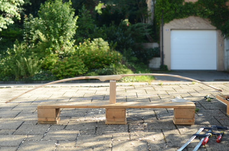 Auch auf der anderen Seite der Pfeilauflage muss noch etwas Holz weg: Dann mal ab damit auf den Tillerstock. Wer genau hinschaut, bemerkt, dass der Bogen etwas schief aufliegt und der Haken nicht genau dort zieht, wo der Pfeil aufgelegt wird. Das liegt daran, dass ich den Bogen am Griff nicht einklemmen kann. Neugiers Design ist hier deutlich praktischer, wegkippen kann er bei ihm ebenso wenig. Fast im Vollauszug. Bitte kommentieren, falls jemand was anderes beobachtet. Die Enden sind noch zu steif, das erste Drittel oben (linke Seite) darf sich noch etwas mehr biegen.