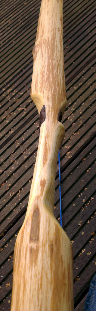 Bei der Pfeilauflage habe ich einen Streifen Leder mit Hautleim angeklebt. (Beidseitig, nur der Rücken ist frei.) Die Pfeilauflage ist noch aus Holz, das ich stehen gelassen habe. Der nächste Bogen bekommt dann eine reine Leder-Pfeilauflage. Ein Bild vom Griff selber folgt später, wurde kurz nach dem Foto oben durch einen Platzregen überrascht, und die Sonne ist immer noch hinter den Wolken.