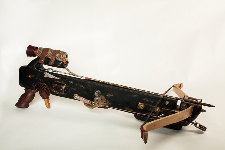 Die Kleine ist ne 9 cm lange "Zapfenarmbrust" und verschiesst tötliche Zahnstocher oder brutale Brandbolzen in Form von brennenden Wattestäbchen! Der Bogen wie immer laminiert..der Rumpf aus Buche und das Untergestell aus banalem Sperrholz!