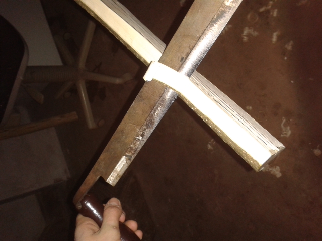 2. Verkeile den Griff in der Auflage und binde ihn fest oder setze - wenn möglich - ne Zwinge dran. (Natürlich Leder oder Holz zwischen legen!)
