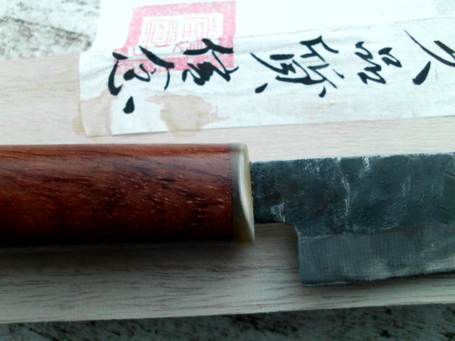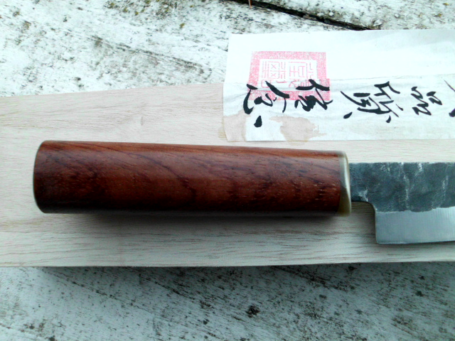 Messer ist angekommen. Von der Form her ist es aber eher ein Gyuto oder Tako hiki als ein Santoku. trotzdem gefällt es mir (für den Preis) ganz gut. Noch ist bei mir auch der Griff in Ordnung. Der wird erst gewechselt wenn er wackelt.