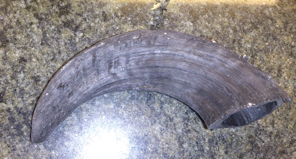 Hier ein Foto des Bogens vorm tillern Hier sieht man rechts vorm Ende die deflexe Stelle. Das war mir zuviel deflex, deswegen habe ich gleich mal was ausprobiert, nämlich das biegen von Traubenkirsche mit der HLP. Geht gut, aber ich bevorzuge die Dampfmethode. An der Stelle ist dann auch das Holz bauchseitig eingerissen, war aber klar, denn ich hatte die Stelle zu Anfang schon einmal gebogen (der Deflex war noch deutlich grösser). Macht aber nix, da zu dem Zeitpunkt schon klar war, dass noch Hornverstärkungen drauf kommen. Was aber mit der HLP ganz hervorragend funktioniert hat, war Drehwuchs wegzuföhnen - den hatte ich schon weg gedämpft, der kam aber bei dieser Biegeaktion wieder zurück. Die andere Seite hab ich auch noch zurecht gebogen, das ging ohne Risse. Dann konnte ich auch gleich mal Schafhorn testen - das hat sich doch glatt als optischer Leckerbissen herausgestellt (kommt in der Präsi) Nachdem ich dann zwischenzeitlich auch noch meine Einfach-Bruchtest-Variante durchgeführt hatte, war klar, dass der Bogen ein Backing bekommt - hierzu hab ich wieder meinen bewährten Leinenstoff genommen, dieses Mal aber doppelt, um dem Kernholz mehr abzuverlangen - denn ich wollte wissen, ob das Holz knittert, woran ich von Anfang an nicht geglaubt hab.