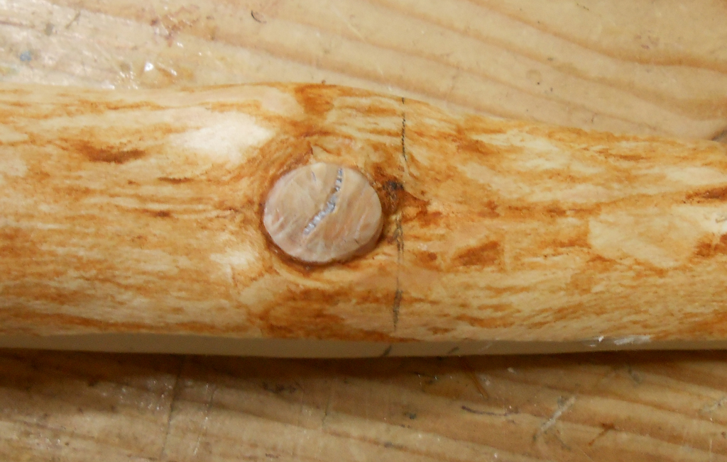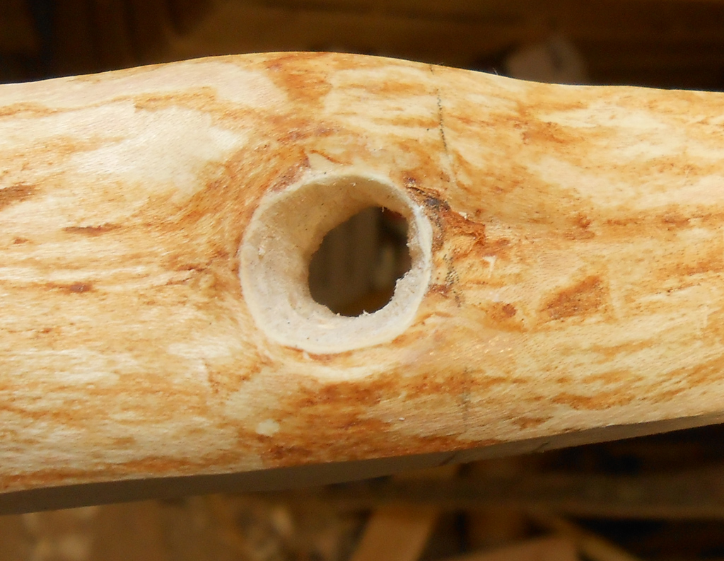 Hallo, also das einzige ausgebohrte Astloch, bei dem ich Bedenken habe, iss das linke auf dem Foto mit den 2 Löchern - da biste schon seeehr nah am Ast und hast die um den Ast laufenden Fasern durchtrennt - aber das iss jetzt nur ne Vermutung - hatte leider noch keinen Weißdorn in den Fingern