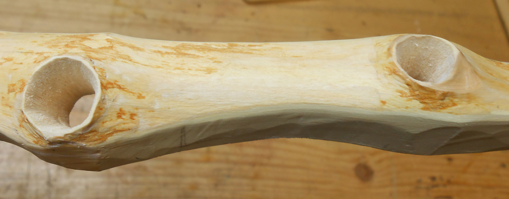 Ich würde die Ränder der Löcher am Bogenrücken so lassen wie auf den Bildern. Ein weiterer Abtrag würde bestimmt seitliche Fasern, die um die Löcher herum gehen, verletzen. Und bei diesem Rücken bist Du ganz sicher auf jede tragende Faser angewiesen.