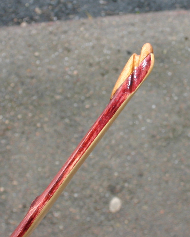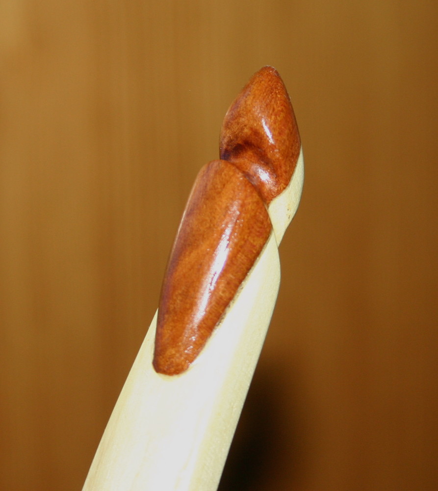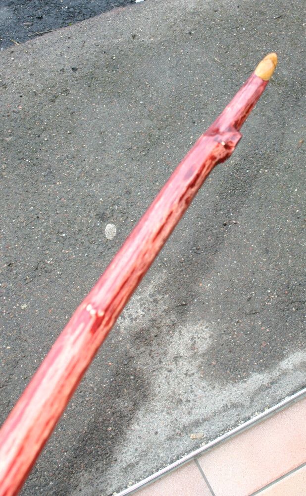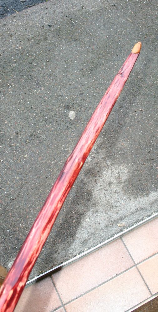 Meine Tochter meinte, ich solle doch mal die schon seit langem herumliegende Beize in violett ausprobieren. Gesagt, getan. Ich habe allerdings nur den Rücken gebeizt und danach die Beize mit feinem Schleifpapier leicht angeschliffen. Darauf gab es dann drei Schichten Schellack. Das Ergebnis ist gar nicht schlecht, mir gefällt´s. Das Einzige, was nicht so schön ist, sind die leicht vertfärbten, angegammelten Stellen im Markkanal. War aber noch im Frühstadium, das Holz ist fest und so sind es nur leichte Schönheitsfehler.