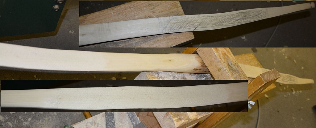 Wie vielleicht schon zu bemerken war, folgt mein "Formgebungsprozess" keinem erkennbaren Muster, es wird immer wieder mal in homöopathischen Dosen Holz abgenommen und dem Gefühl nach weitergemacht, bis am Ende ein hoffentlich bogenähnliches Gebilde übrigleibt.