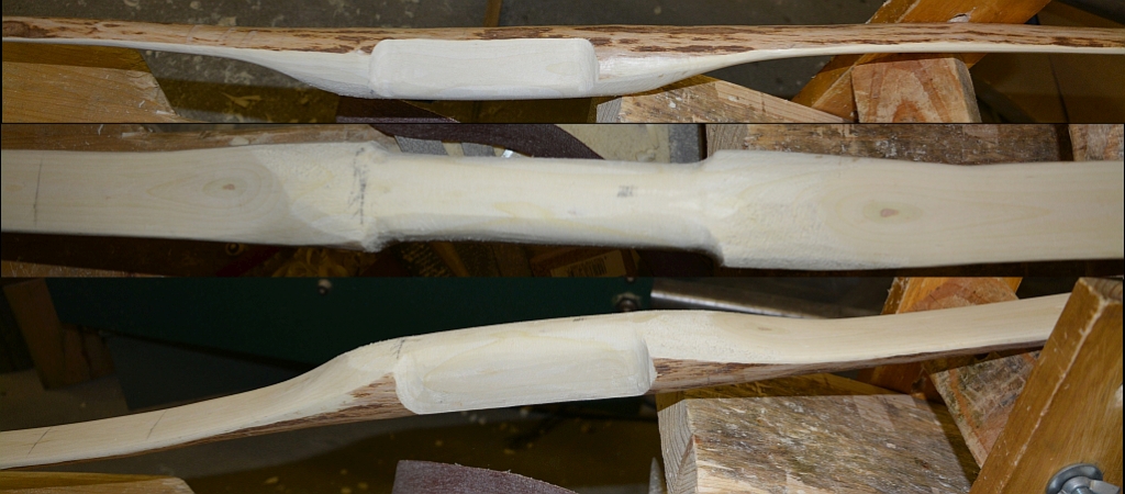 Stave 2 wurde mal auf knapp unter Standhöhe gebracht, nachdem er sich im Bodentiller für meine trüben Augen vernünftig biegen tat: Ergebnis so la la, erst mal auf halbwegs normal bringen und ein Foto vom abgespannten Bogen machen: Besser...nicht perfekt, aber besser: Zeit, sich mal um den Griff zu kümmern, sonst wird das mit einer ordentlichen Standhöhe nix... Die nächsten 15 Fotos erspare ich euch. Da ist der Griff in verschiedenen Stadien meiner unzufriedenen Unentschlossenheit drauf.