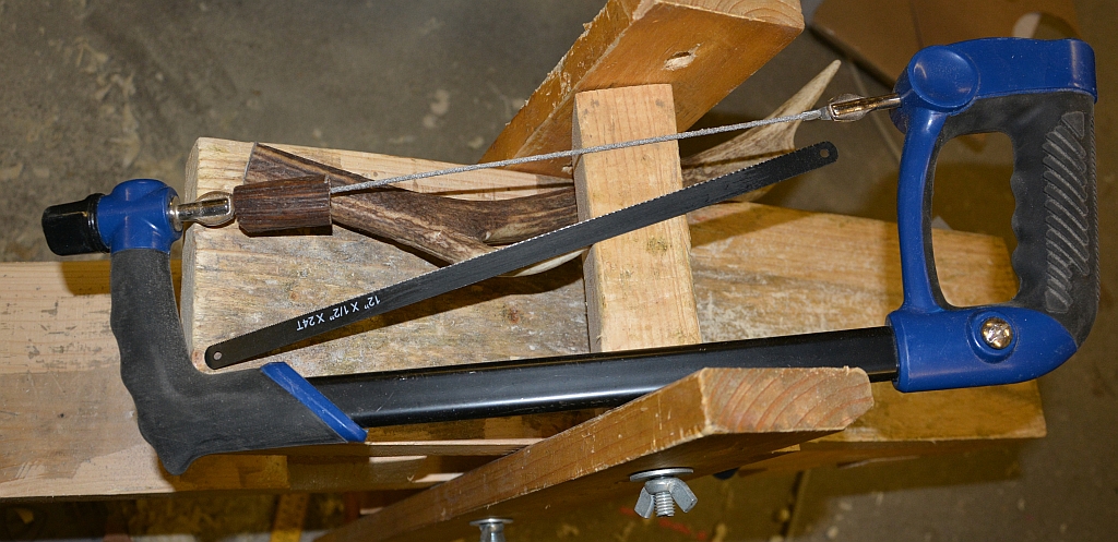 Ich hab den Griff dann vorerst auch Griff sein lassen und mich mit den geplanten Geweihoverlays beschäftigt. Erst mal die Abwurfstange, die ich von einem Jäger geschenkt bekommen habe, zurechtsägen: