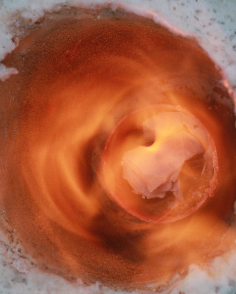 Wenn der Brenner mit dem Gebläse läuft, dann sieht es so aus. Dann gibt es noch selbstgebaute Formkästen , Formsand und eine lange Zange zum herausholen des Schmelztiegels aus der Esse. Bis auf die Gasflasche hab ich alles selbst gebaut-- eine 5kg Flasche reicht jetzt für 4-5 Güsse mit 500 g Bronze aus.