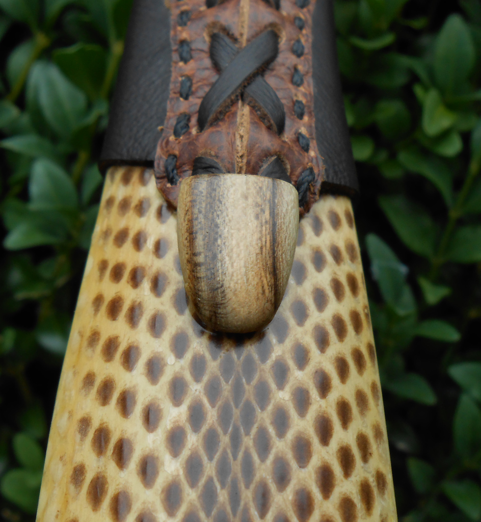 Aufgrund der vielen Nachfragen, hier noch mal ein paar Bilder vom Bogenbauch. Die Schlangenhaut habe ich nicht gekauft, sondern von einem guten Freund geschenkt bekommen, daher kann ich auch nichts näheres dazu sagen. Verklebt habe ich die Haut mit Uhu Endfest. Ursprünglich hatte ich geplant, die Haut mit Hautleim zu verkleben, aber da ich schon Schellack auf dem Rücken hatte, wusste ich nicht genau ob Hautleim auf Schellack hält, daher habe ich sicherhheitshalber Epoxy genommen.