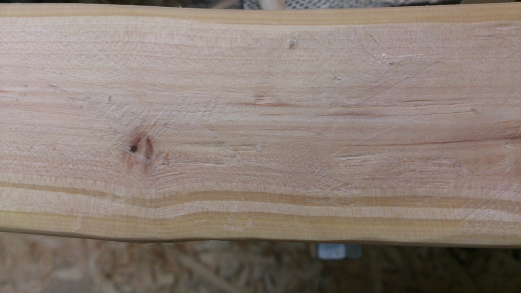 Leider musste ich Heute feststellen, dass ein ca. 25 cm langer Riss vom Bauch ausgehend bis fast zum Rücken durchgeht. Wenn man dann noch die äusseren extrem dünnen Ringe runternimmt, ist das Holz komplett durchgerissen. Und da das Ding Drehwuchs hat, isses mit Riss unbrauchbar. Iss wahrscheinlich beim spalten passiert