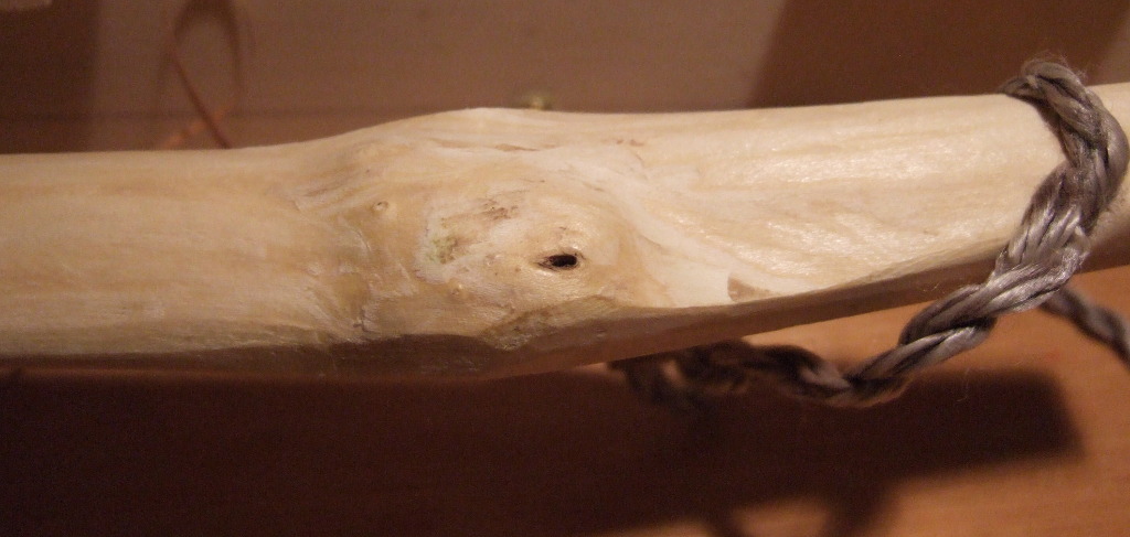 Das Problem war wahrscheinlich, dass das Stämmchen schräg stand und dadurch Zugholz aufgebaut hat (im ganzen Stamm läuft der Markkanal nicht mittig). Ich habe aber den Bogen "schräg" in den Stamm gelegt. Beim Trockenen reagiert das Holz unterschiedlich und verzieht sich.