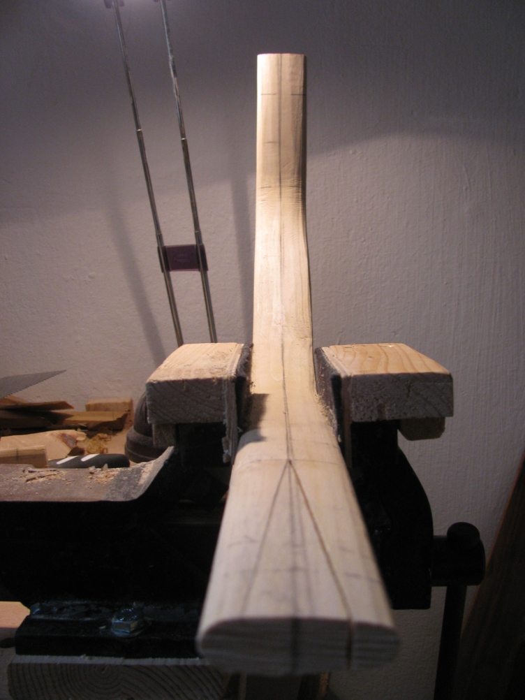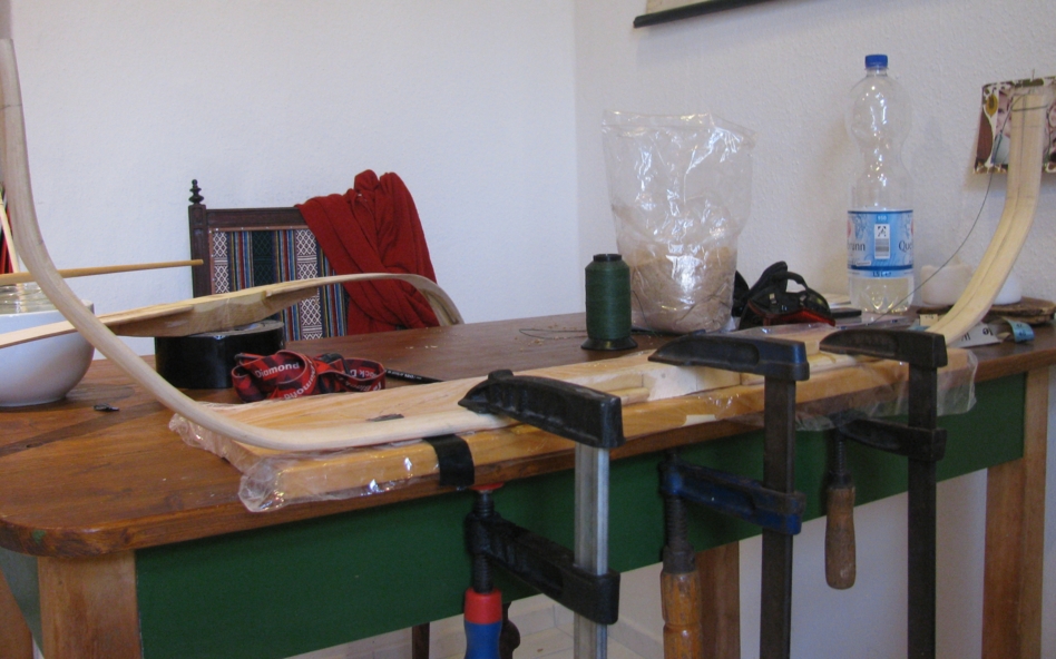 sieht schonmal mehr nach Bogen aus. Allerdings sind die Wurfarme im Kasan-bereich noch leicht verdreht, was ich vor dem Verleimen noch mit der HLP zu korrigieren gedenke. Aber es fluchtete schon mal recht zufriedenstellend.