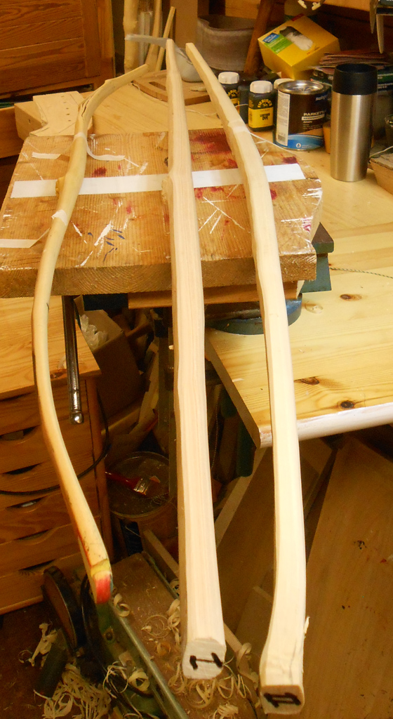 Bei Holler II habe ich den Bauch noch ein wenig gerundet. Er bleibt aber weiterhin auf das Kantholz gespannt, damit er sich nicht verzieht und damit ich die Sehnenlage noch ein wenig korregieren kann, denn sie läuft derzeit ca. 1 cm an der Griffmitte vorbei.