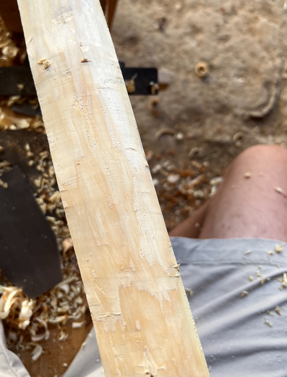 Wenn die Ringe im Splint nur 1 mm dick sind und wie üblich bei Eibe viele Totäste und Wellen im Stave sind, dann möchte ich sehen wer es schafft auf 2m Länge nicht einmal 1 mm zu viel weg zu nehmen.