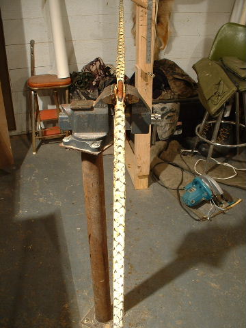 Der Bogen wurde im Stadium Bambusbacking/Eibenkern mit flachem Bauch auf ca. 40 lbs getillert, hatte nach Aufbringen der Hornlage 57 lbs und landete nach Abrunden des Bauches irgenwo bei 50 lbs.