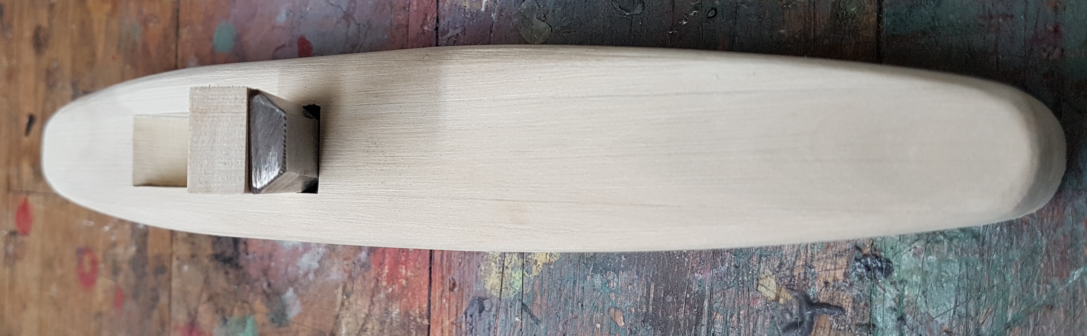 Der Korpus besteht aus 4 Teilen Ilex, die Sohle und der Keil sind aus Hainbuche. Für die Hobelklinge habe ich einen alten Stechbeitel genommen und auf ca. 55° geschliffen (falsch geschrieben, der Schneidewinkel, also inkl. Hobelbett liegt bei ca. 55°). Die Klinge ist gerade. Zusammen mit der Hohlkehle in der Sohle habe ich somit einen Tiefenanschlag. Es hat sich während der Benutzung herausgestellt, das der Hobel optimal für Schlussarbeiten, wie glätten der Oberfläche geeignet ist (auch bei schwierigem Faserverlauf, hier helfen die 55°), weniger für Mengenabtrag (dafür benutz ich meinen Einhand-Hobel).