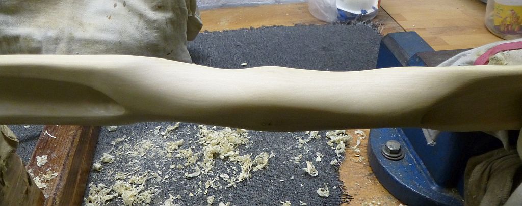 Gestern habe ich beide Tips und den Griff auf ihre vorerst endgültige Form gebracht. Nach Bearbeitung mit der Schwanenhalsziehklinge sind die WA jetzt 18mm dick, aber immer noch zu stark.