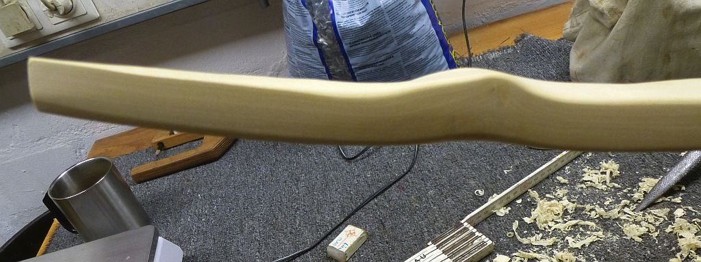 Die letzte Woche ist nicht so doll viel passiert. Jeden Tag hat der Bogen um die 10g an Gewicht verloren und zusätzlich hab ich jeweils noch 2-3g runtergekratzt. Der ist immer noch zu feucht, aber immerhin gewinnt er in der Werkstatt bei 65% Luftfeuchte jetzt wieder Gewicht. So langam wird es. Zur Zeit hab ich noch 780g.