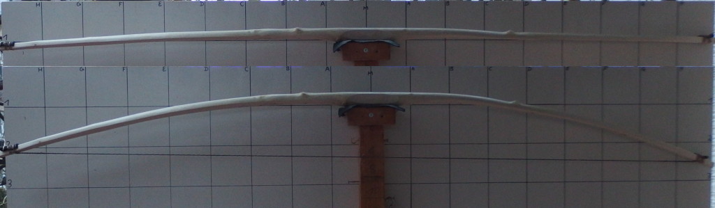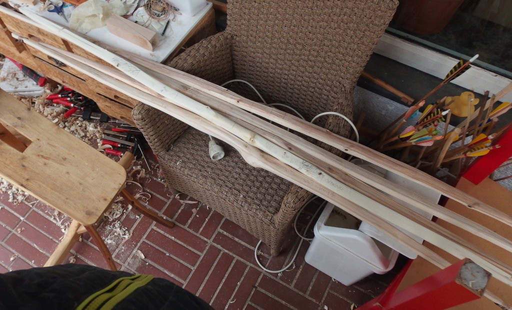 Der Ahorn ist mal wieder irgendwie Gummi-artig. Hatte schonmal einen Ahorn angefangen, und obwohl der keine Hitze sah, war der wie Gummi. Irgendwie überzeugt mich Ahorn kein bißchen, ich persönlich sehe keinen Vorteil gegenüber Hasel. Ob der da die 30# Grenze reißt, sehe ich noch, wahrscheinlich muss ich ihn kürzen. Die Breite ist mit 31mm griffnah sehr wenig. Die Länge sind noch 180cm, da ist noch Luft. Also Wickelnocken und schonmal etwas tillern. Griffe sind nur grob ausgearbeitet.
