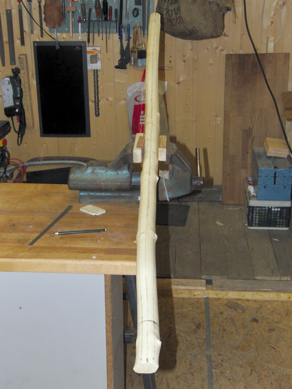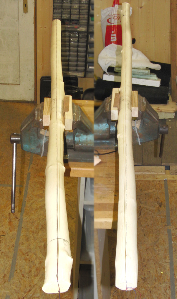 Der Rohling hat in jedem Wurfarm einen ungünstig gelegenen Totast im Biegebereich. Im weiteren Verlauf werde ich diesen wohl mit einem hierauf dressierten großen nachtaktiven Waldvogel auf den Pelz rücken