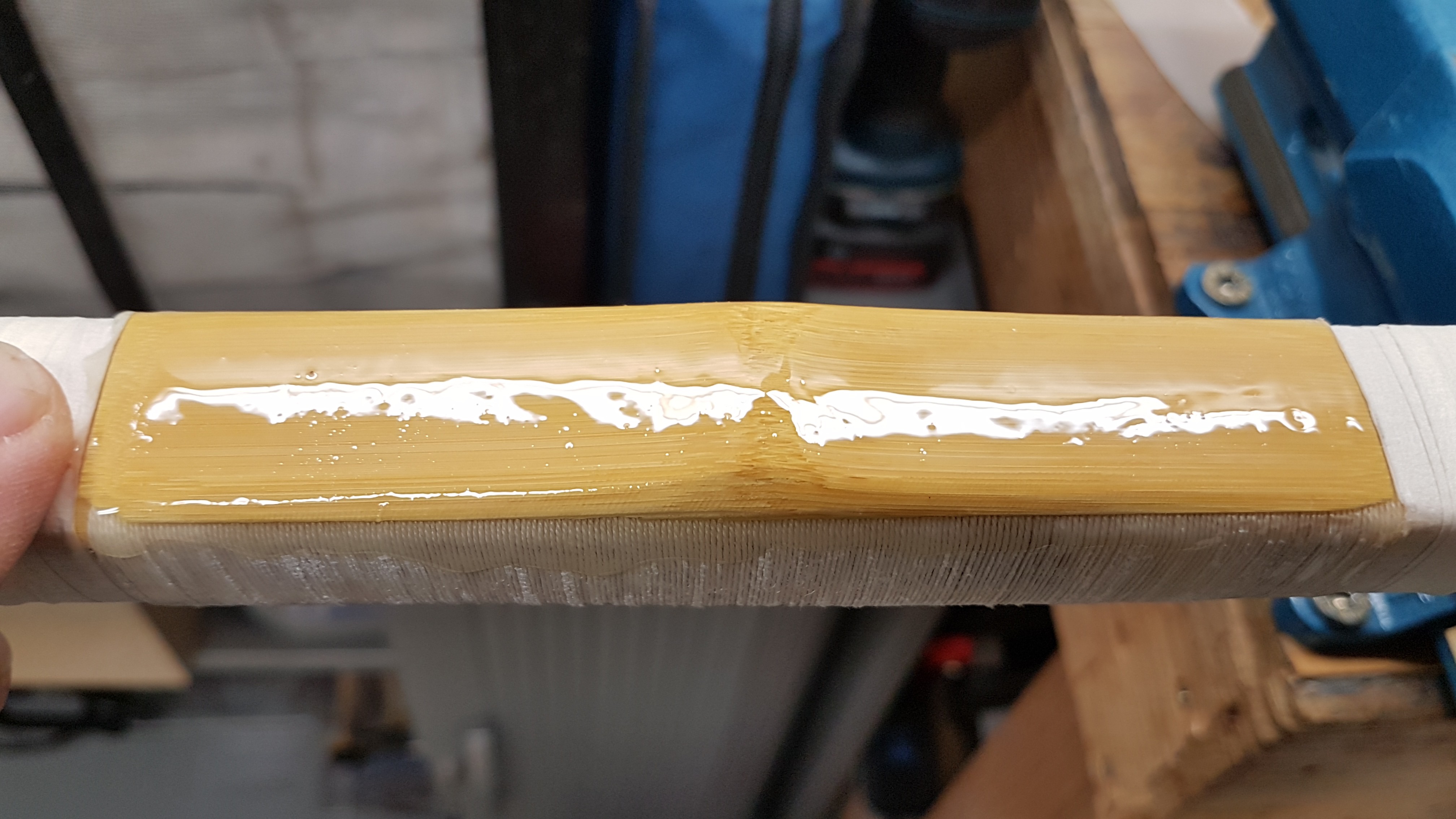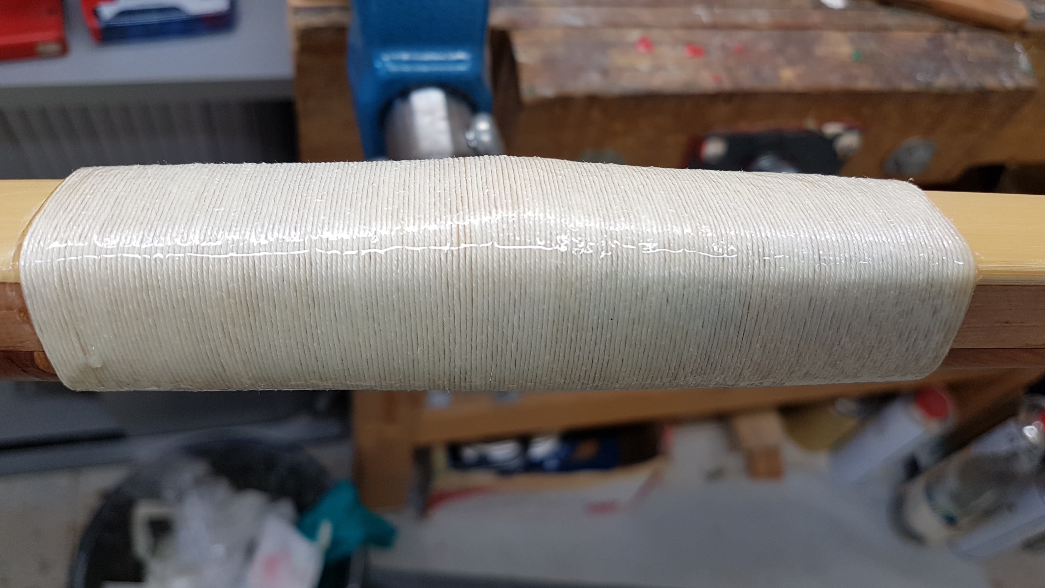 Step3: überschüssiges Epoxid abschleifen, Kanten der Bambusverstärkung gut abrunden. Wieder mit Epoxid einschmieren und die 2. Wicklung, dieses Mal mit dickerem Leinenzwirn Nr. 10, herstellen. Danach die Wicklung wieder mit Epoxid einschmieren und einföhnen.