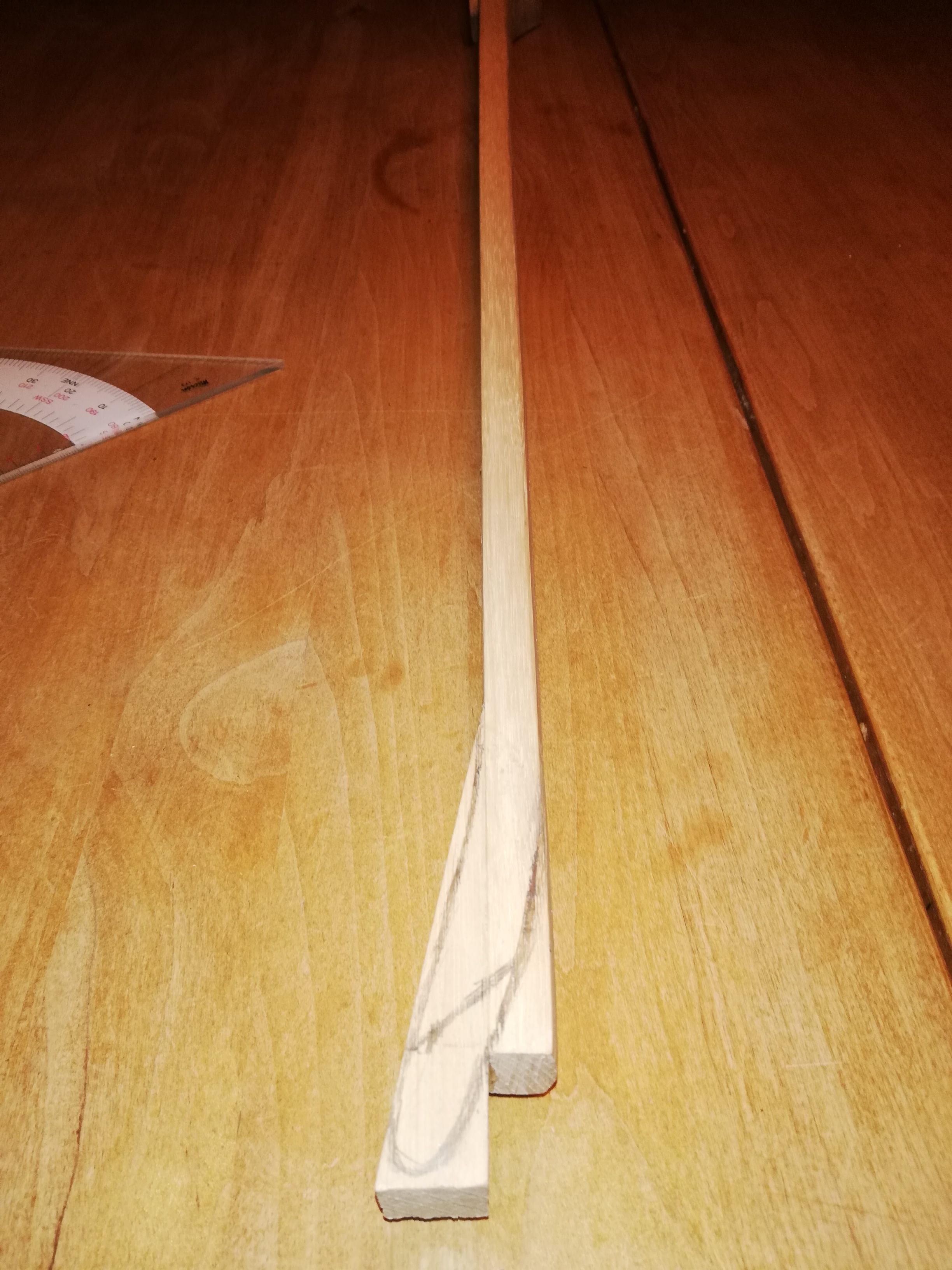 Ich hab mir die Maße für den Bogen von einer Bauanleitung für Hickory Flach Bögen übernommen, irgendwo muss man ja Anfangen. Die Proportionen sahen für mich ansprechend aus und mit den "Filetstücken" der Wurfarme habe ich noch Holz für einen zweiten Bogen aus dem gleichen 4 Kant Stave