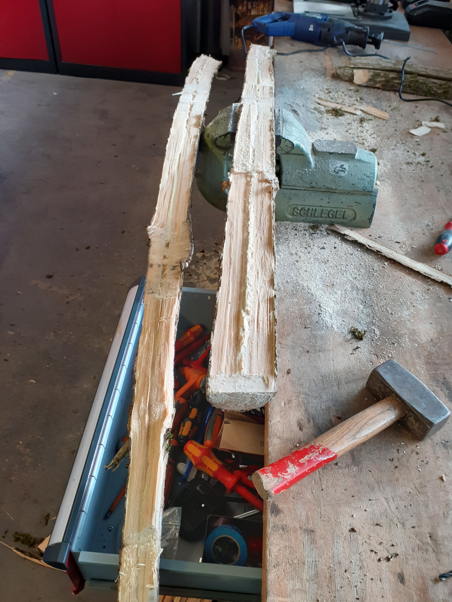 Mal längs gesehen,nebenbei die Sauerei in meiner Küche und die verwendeten Werkzeuge: Balsahobel,Taschenmesser und Trockenbauraspel. Alles sehr leise Werkzeuge in einem Mehrfamilienhaus. :D