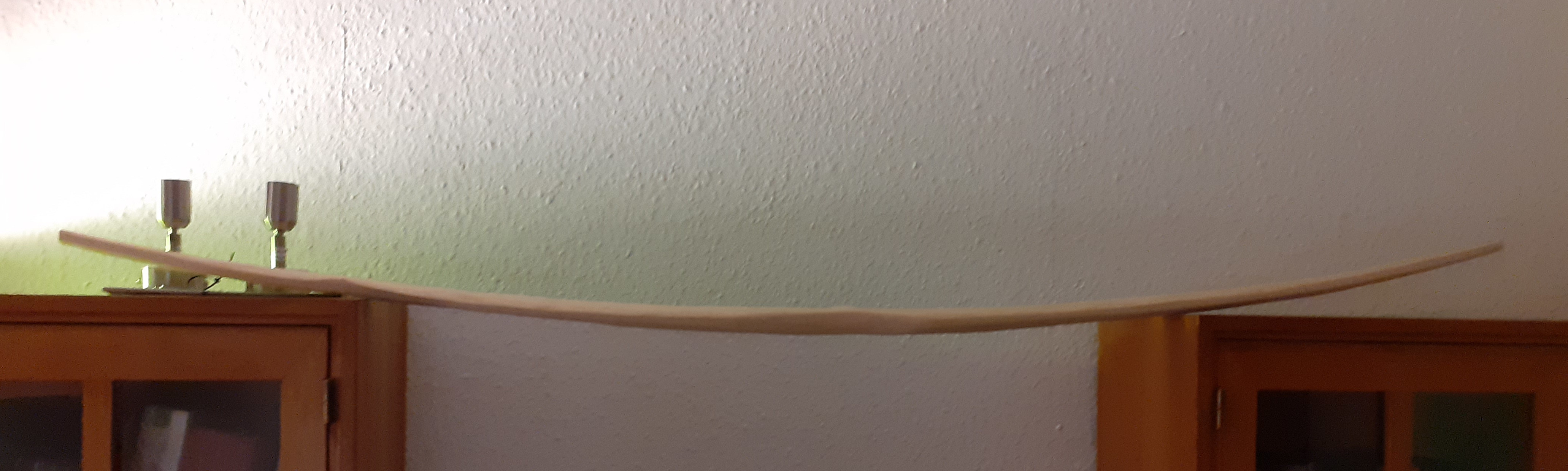 Bis jetzt nur eine Latte mit Dicken-und Breitentaper und ner Einschnürung in der Mitte auf dem Weg zu nem Propellerbogen o.Ä. ;D Maße bis jetzt 12-19-28-19-12mm Dicke,17-42-48 ("FO")-32-48("FO")-42-17mm Breite. Da geht noch gut was weg,der fühlt sich im Bodentiller trotz Restfeuchte noch an wie 90# ::) .