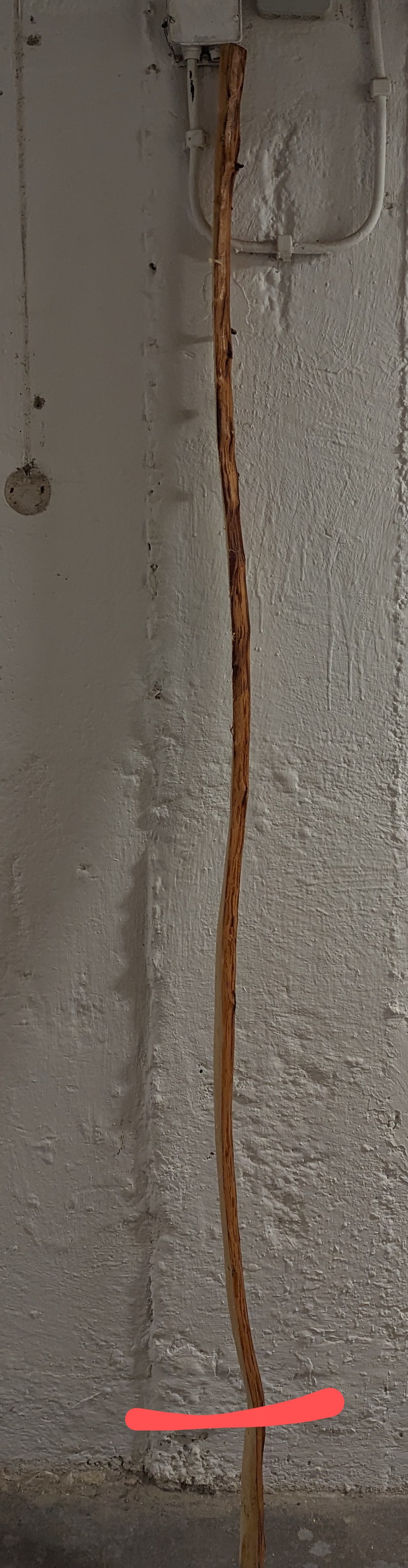 Den Hasel hab ich an der Seite des späteren Rücken von der Rinde befreit und schon mal einen ungefähren Plan aufgezeichnet. Dann auf eine länge von 180cm gekürzt und das ungefähre Profil aufgezeichnet: Der Hasel hat am Rücken nur einen Ast den ich mittig in den Übergang vom biegendem Teil des WA's zu den Nadeln setzten werde. Ansonsten hatte ich, auf den ersten Blick, so unkompliziertes Stück Holz in der Hand.