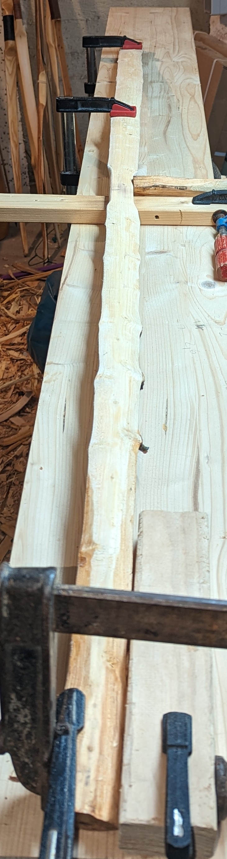 Die Kopfseiten der Fadeouts hab ich dann noch mit Leim versehen und auf ein Brett gespannt. Werkzeuge: Säge, Beil, Ziehmesser, Holzleim, Schraubzwingen,