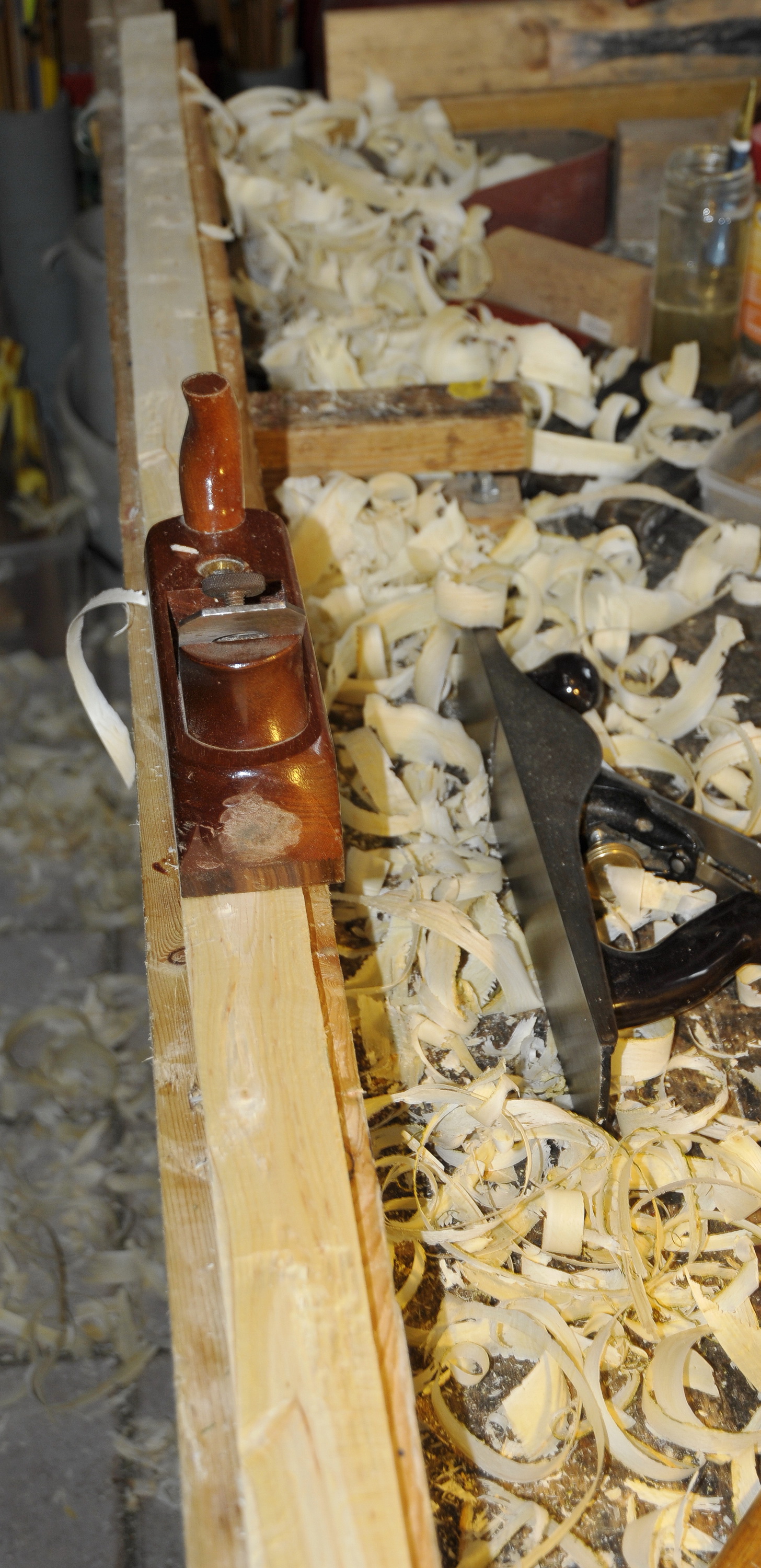 Leider war das Holz gefroren und hat sich schwer verarbeiten lassen, ich habe mit der Bandsäge grob vorgeschnitten und dann mit den Hobeln auf 1,5 cm runter gearbeitet.
