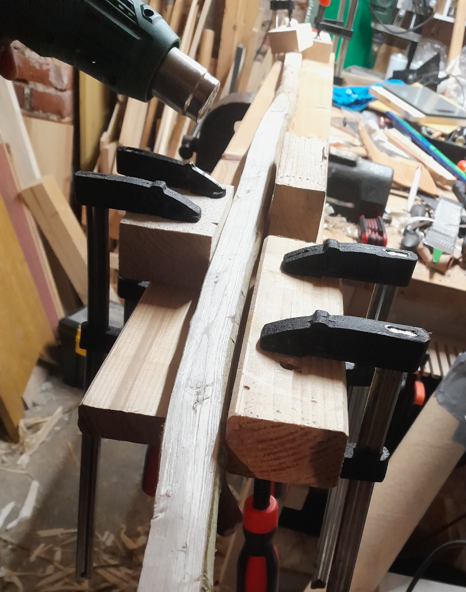 So, nun hab ich ihn doch mit Hitze etwas gezähmt, den krummen Teil, der war noch mehr aus der Spur geratenin der letzten Woche, da wär sonst ein 1,40m-Bögelchen draus geworden, das trau ich mich nicht mit unbekanntem Holz: