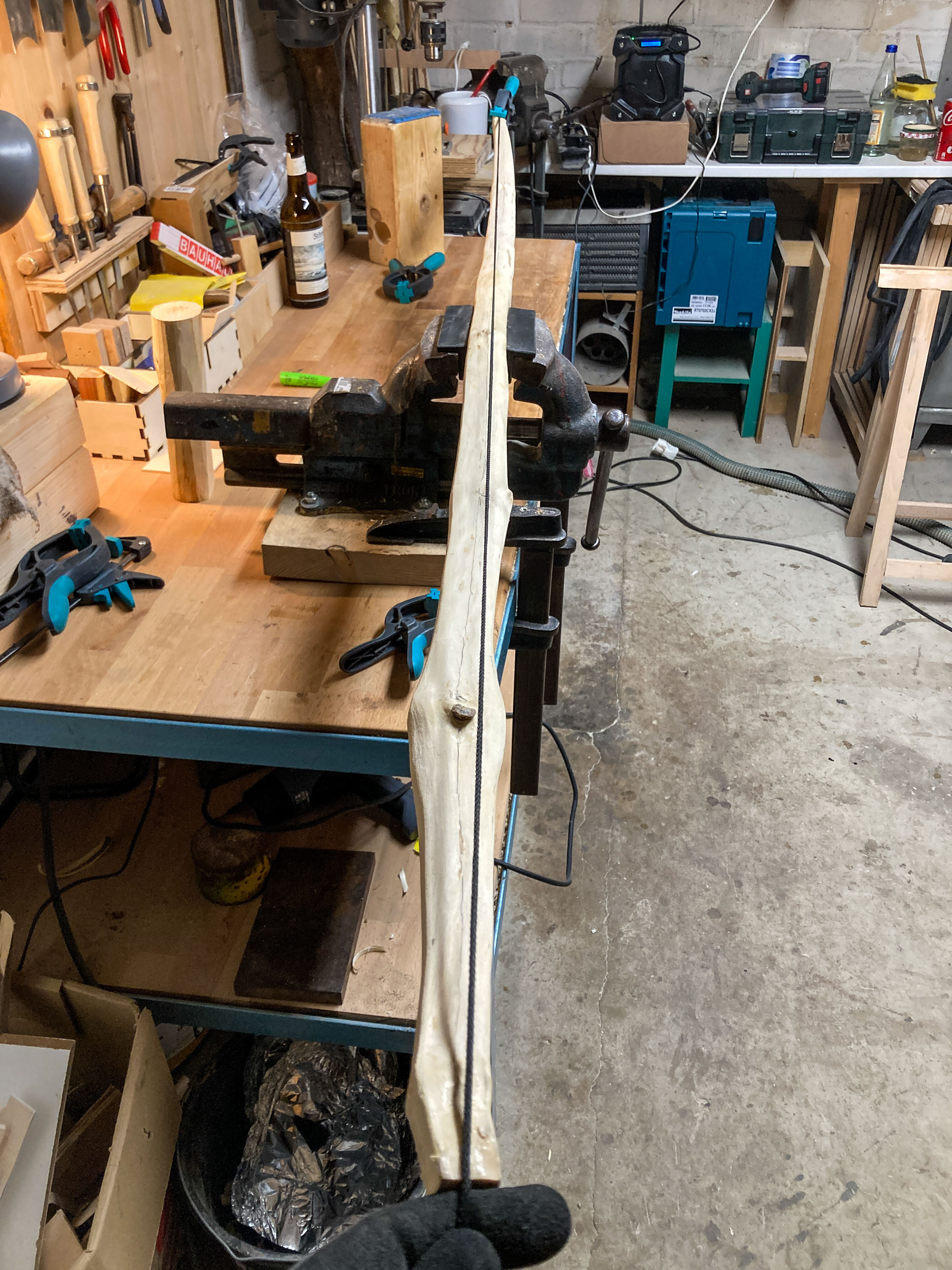 Der Holler verliert nur noch wenig Wasser, es kann weitergehen. Die Form hat er weitestgehend gehalten, das gefällt mir schon ganz gut. Obwohl die Sehnenlage vor dem Trocknen nicht so gut aussah, passt jetzt alles und mit den noch überbreiten Tips ist genug Spielraum. Er ist 173cm lang, der Wurfarm mit dem toten Ast soll nach unten und das passt auch. Ich finde die Vorstellung seltsam, die dicke Stelle im oberen Wurfarm zu haben. Technisch gesehen ist das wahrscheinlich total wurscht, aber mir kommt es komisch vor.