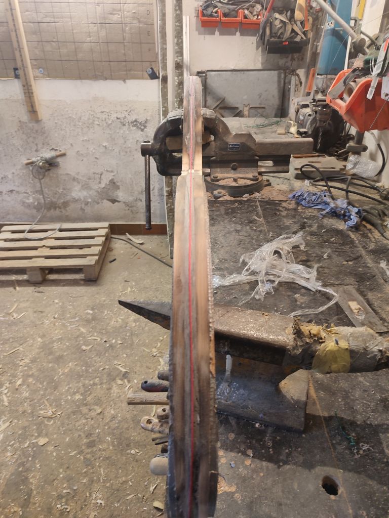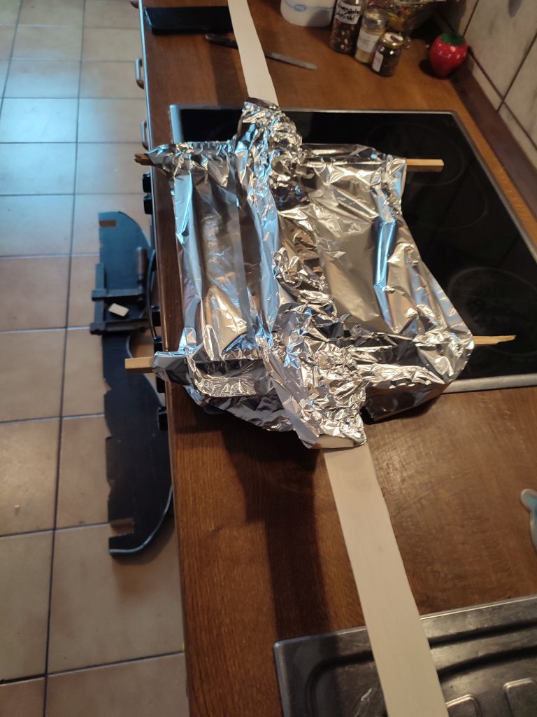 Danach habe ich es auf die form fixiert und geröstet. Morgen wird das in die Mitte geklebt, sodass übermorgen der Rücken drauf kann. Bisher sieht es gut aus. Kein drehen, keine Risse alles auf go ;)