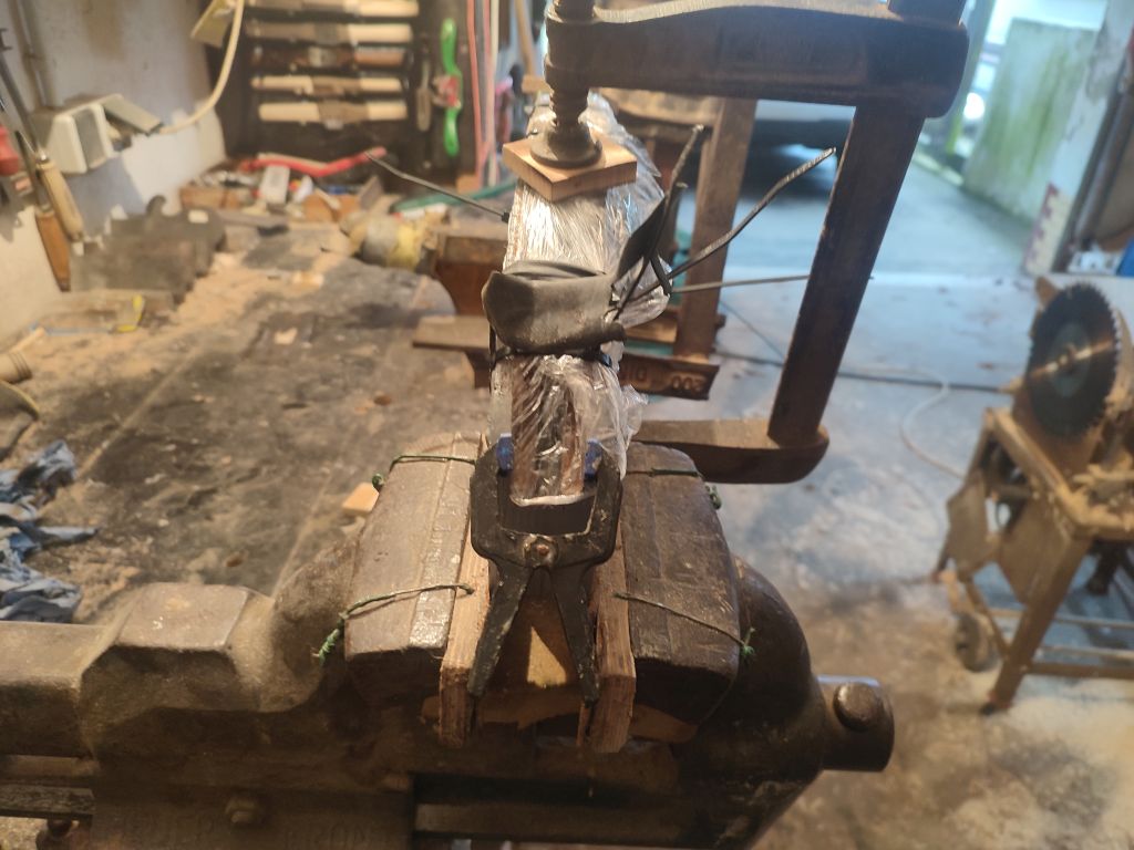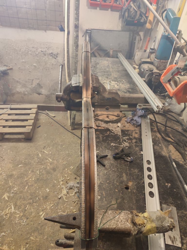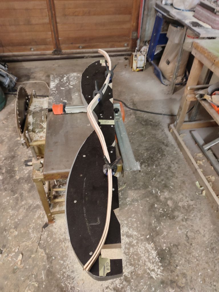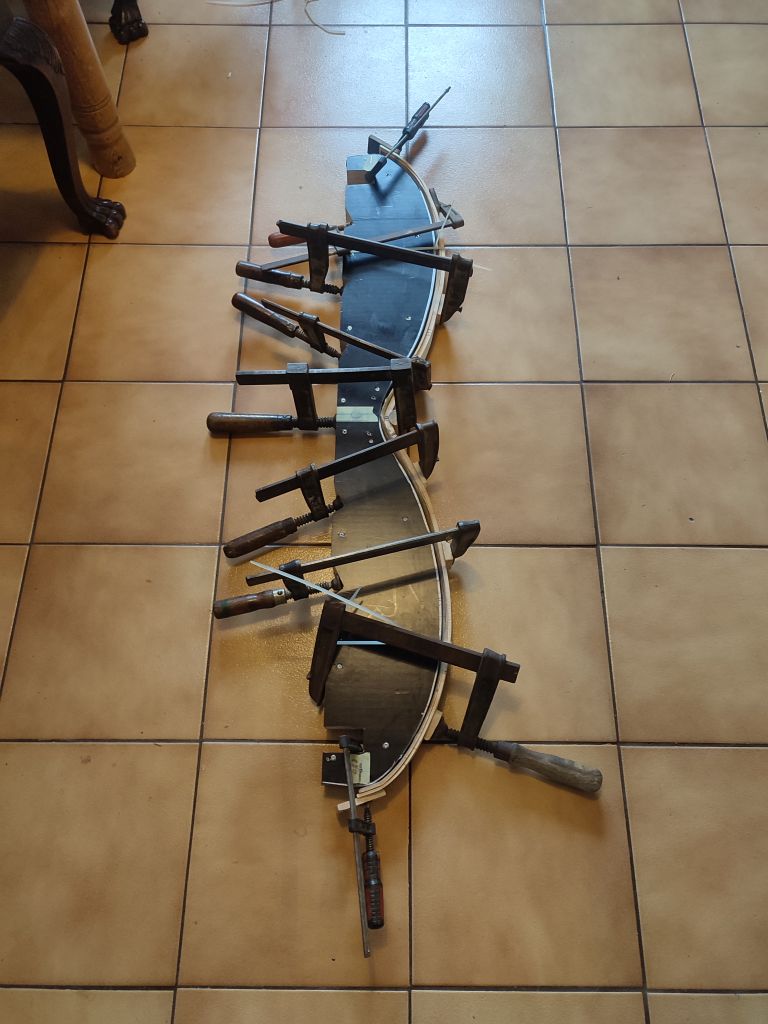 Heute habe ich die Hasellaminate erst gedämpft und dann in die Formgezogen. Der Rest ging mit dem Heißluftfön. Zuerst den Rücken in die Form Zwingen, dann mit Kabelbinder fixieren, damit ich die Zwingen wieder entfernen. Jetzt ist alles bereit das zweite Laminat auf zu nehmen. So darf alles mal trocknen...