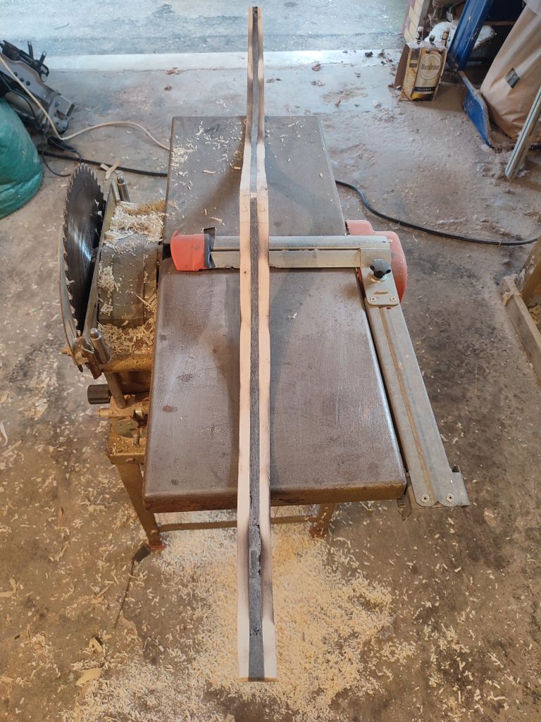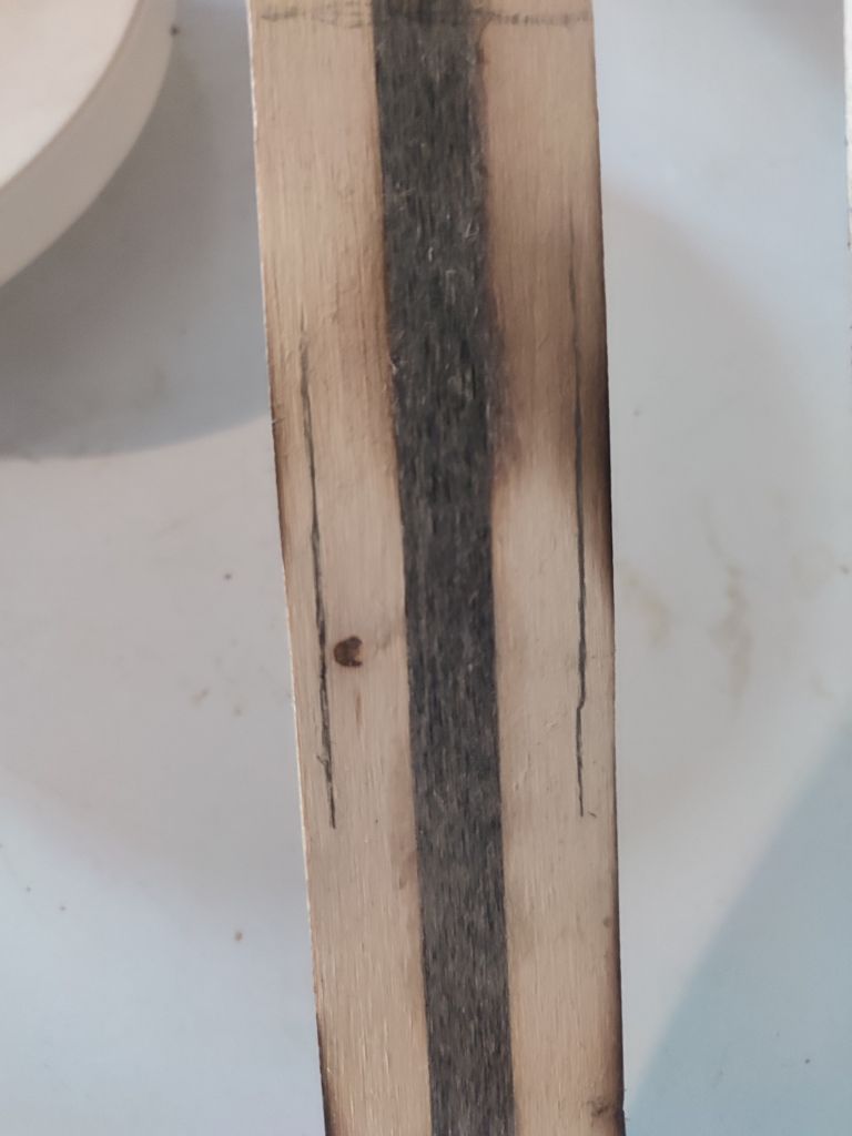 Naja 4,5 Wochen sind jetzt nicht gerad üppig, aber ich denke das sollte gehen. Der Hasel sieht gut trocken aus und verliert zur Zeit kein Gewicht. Die Laminate sind erneut an dem Bandschleier abgezogen und alles sieht gut, alles schön gerade. Das Horn wurde auch schon vorbereitet, also es wurde grob zugeschnitten und am Bandschleifer grob auf Dicke gebracht. Danach habe ich das Horn erhitz und gerade gebogen, nun auf ein Brett mit doppelseitigem Klebeband fixiert und mit dem Bandschleifer auf der Klebeseite plangeschliffen. Jetzt konnte ich das Horn umdrehen, mit Klebeband fixieren und auf Fertigmaß 4mm Schleifen. Danach wurde es in 1,5cm gerade Streifen geschnitten. Morgen wird dann das Baulaminat geröstet und in der Mitte aufgeschnitten, damit das Horn eingeklebt werden kann.