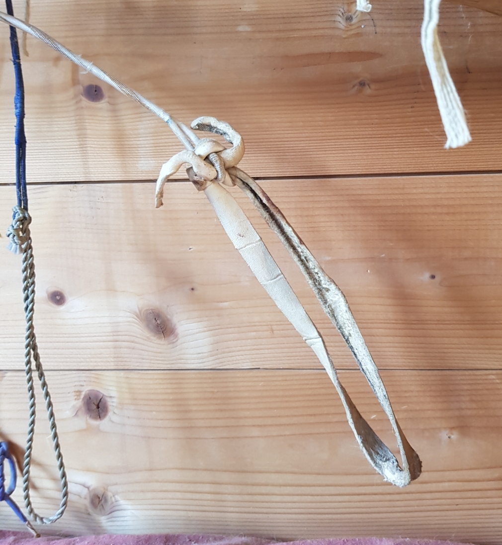Die langen Öhrchen wurden an den Mittelstrang angeknoten... rechts, Öhrchen aus Rohhaut von einem mongolischen Bogen, gemacht in Ulan Bator, links Sehne für den gleichen Bogen gemacht in Deutschland