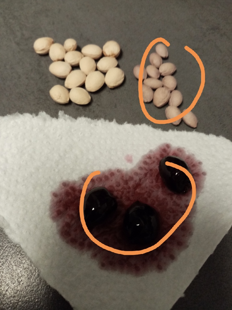 Also mit Früchten und Kernen kann ich Heute schon liefern, ich habe mich erbarmt und ein Glas aus der Einlegeware zu stiebitzen, gut morgen ist eh Feiertag,, so die Kirschen samt Wodka sind im Nirvana verschwunden, geblieben als Beweis-sind die dunklen Kerne des Kirschbaums und die hellen vom Nachbarbaum mit Süßkirschen...