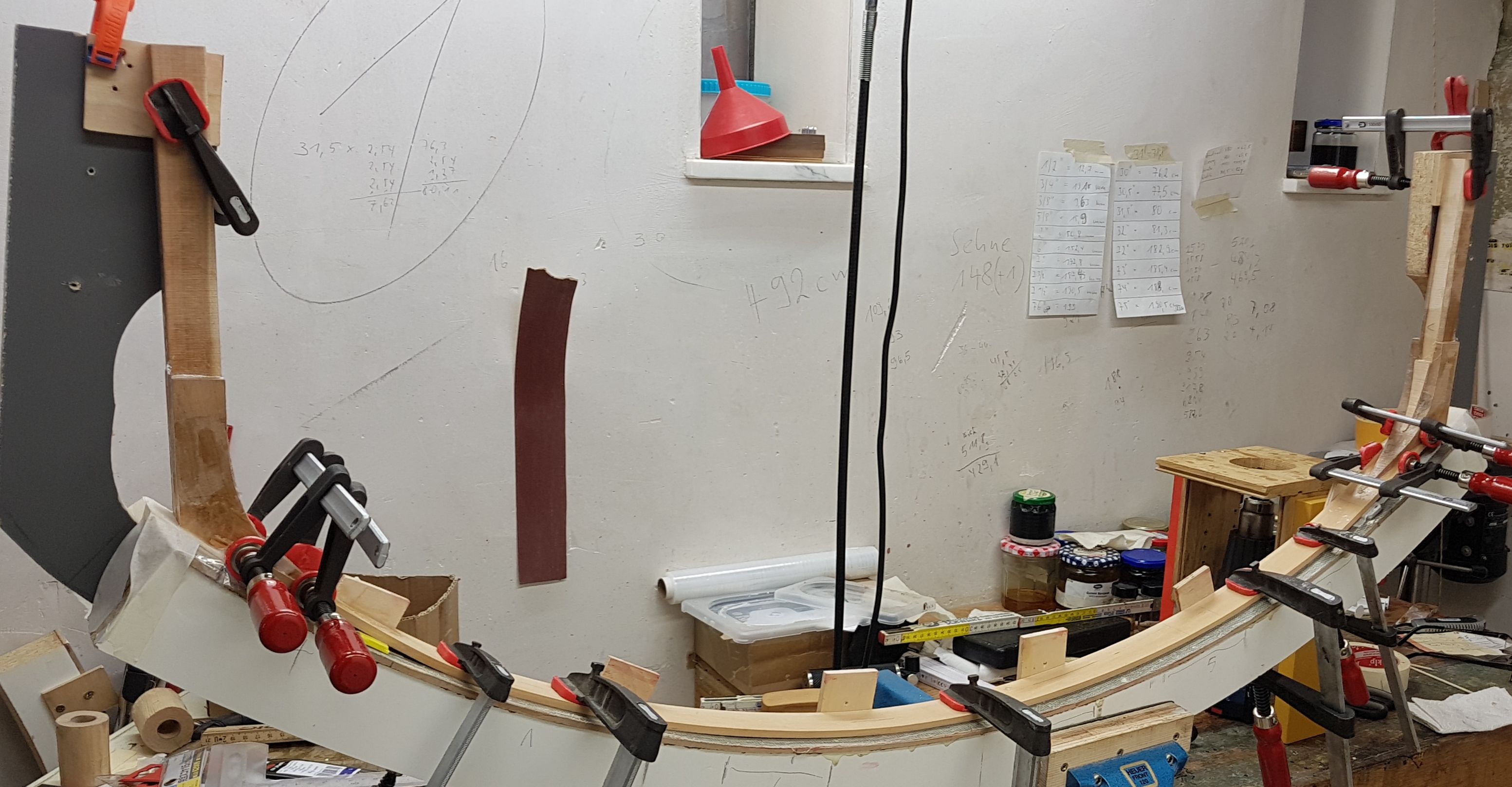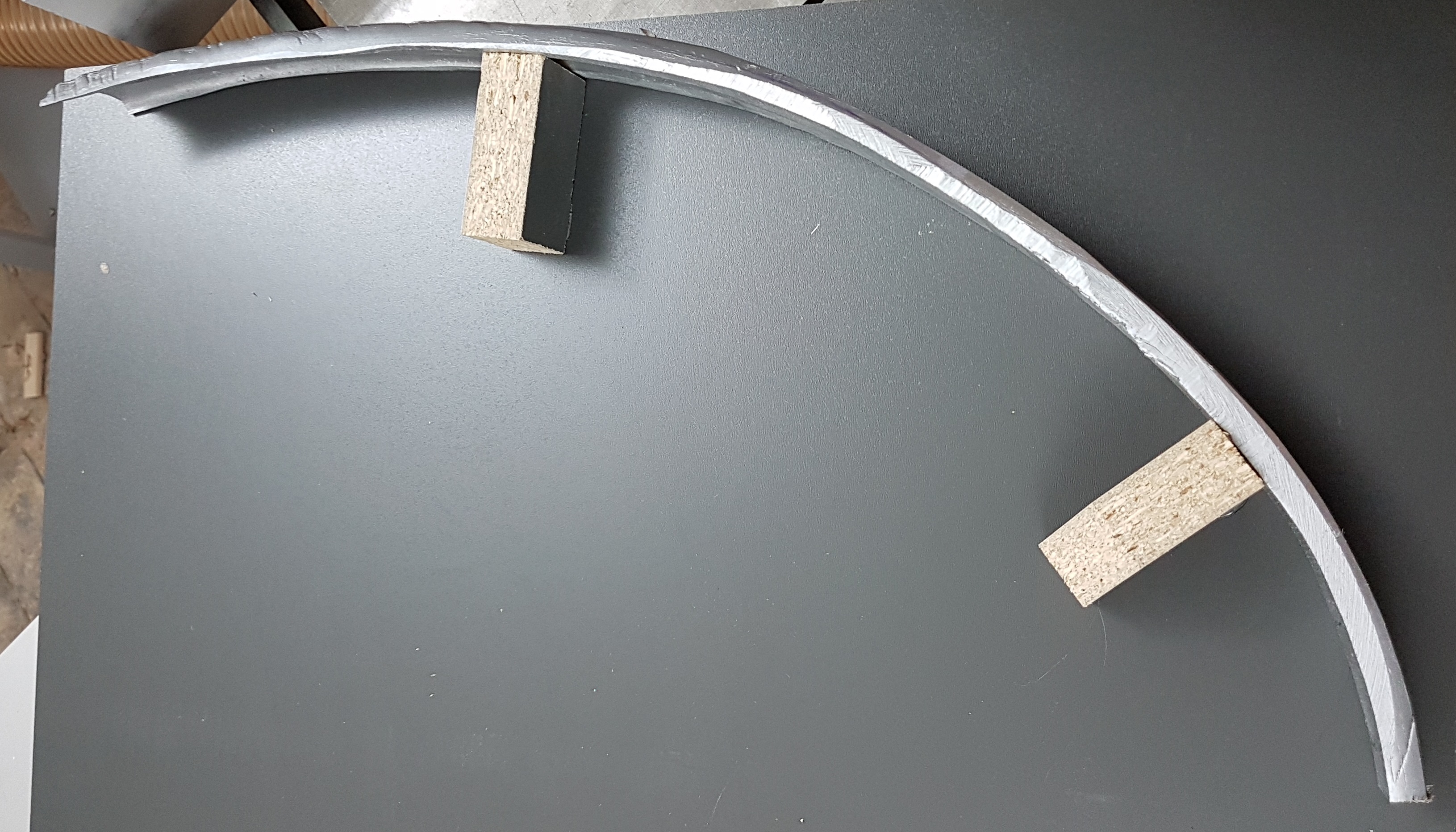 Dann in den Backofen geschoben und bei ca. 90° C Oberflächentemperatur gebogen. Die Dicke Seite wird in Kürze nochmal nachgebogen.