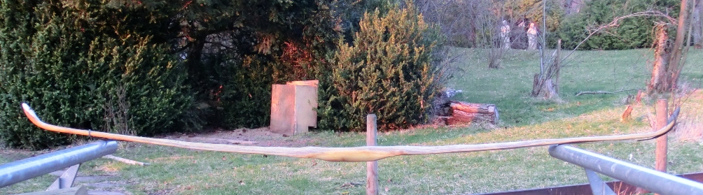 Jetzt habe ich Bilder vom (vor-)letzen Stand - der Reflex beträgt ca 8cm, d.h. von den 13cm beim Trocknen der Sehne sind noch 2/3 geblieben. Wie geschrieben. Länge NtN aufgespannt 130cm, bis 28" ausziehbar und aktuell 49#@27