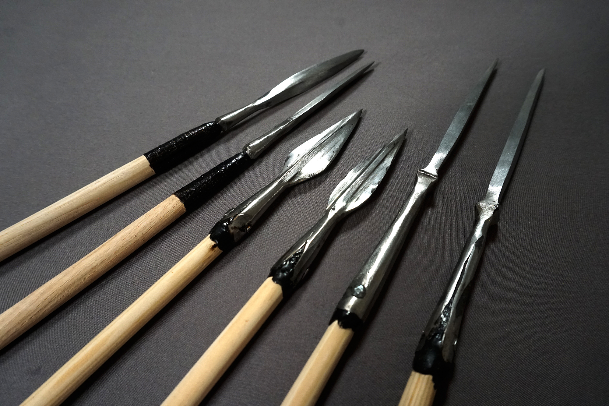 Zwar sind auch Spitzen aus Knochen gefunden worden, hauptsächlich wurden jedoch Spitzen aus Eisen angebracht. Dabei variierten die Ausführungen zwischen Dorngeschossspitzen (hier zwei) und Tüllengschossspitzen (hier vier). Spitzenrekonstruktion von Hector Cole.