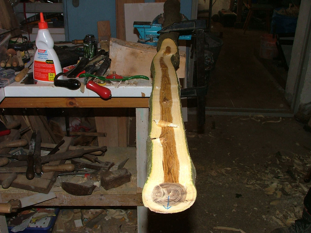 Ganz wollte ich die Idee des Hohenaschu Nachbaus aber doch nicht aufgeben, als zurück in den Wald. Ich hab da gestern einen Goldregenstamm gesehen der 12 cm Durchmesser hatte nur war der kurz und krumm. Dachmessen vor Ort hat eine verwertbare Länge von 90 cm gezeigt und eine Krümmung in eine Richtung