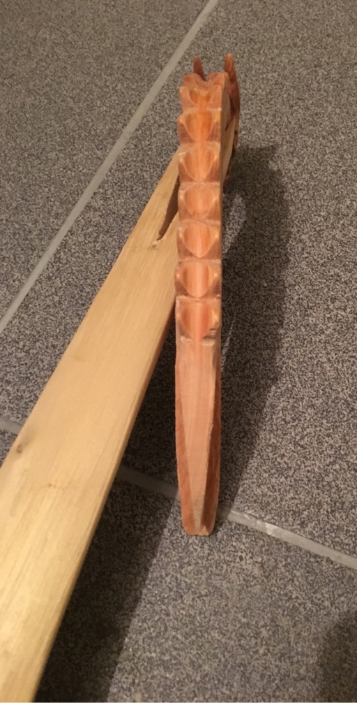 Eine Drachenkopf-Siyah für Robinie 2 ist soweit vorbereitet, dass ich sie einspleißen kann. Auf den Fotos ist Alles nur zusammengesteckt, muss also natürlich noch eineuliert und verschliffen werden. Das mach ich aber erst, wenn die zweite soweit fertig und das Horninlay im Maul eingepasst ist. Findet Ihr, dass die zu klobig aussieht? Handschock-mäßig sollte es gehen, da die Siyah nur 32g wiegt (das abgesägte Ende, das noch intakt war, wiegt 27g).