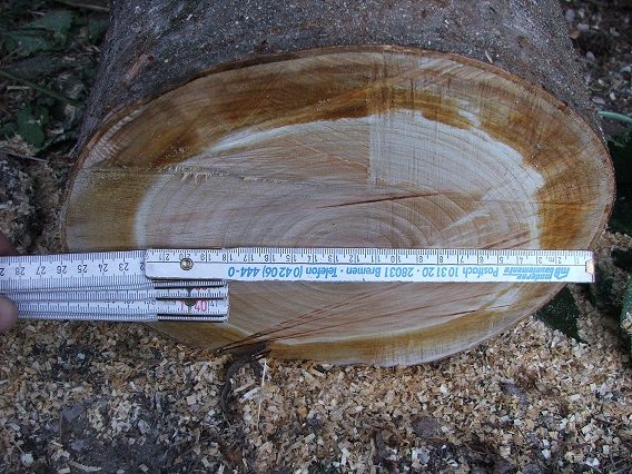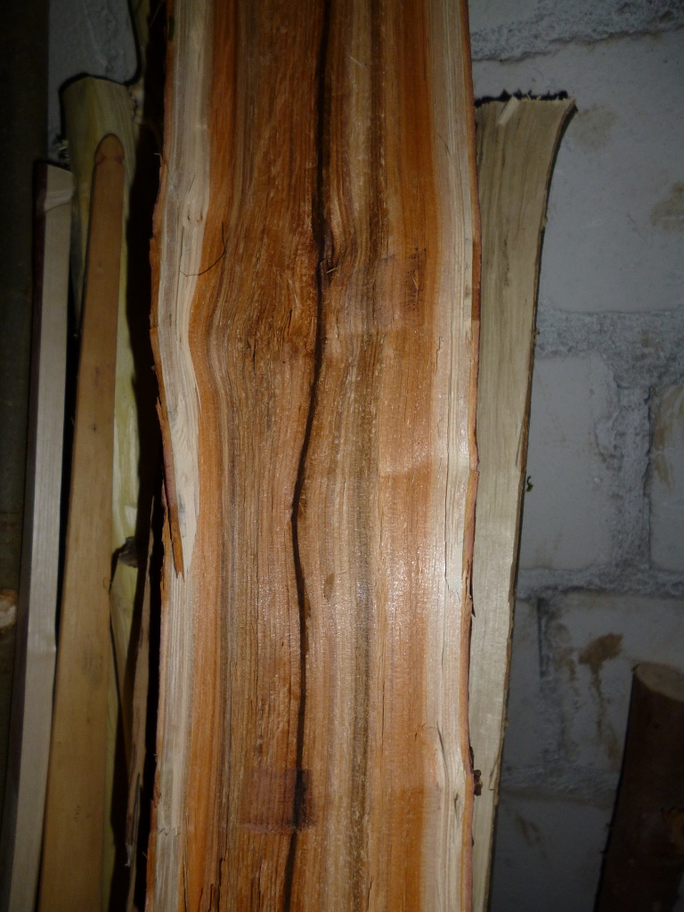 Bin vor drei Wochen im Wald spazieren gewesen und war erstaunt das noch gerücktes Holz in großen Mengen da liegt. Gleich mal den Förster anrufen und fragen ob nicht unbedingt 30 Meter für günstiges Geld weg müssten zu so später Zeit. Günstiger nicht aber wegen dem langen Winter und folgender Nässe wäre alles verzögert und ich könnte Brennholz ordern. Und als letzte Woche der Haufen aus Buche, Eiche, Esche (fast unbrauchbar) geliefert wurde rollte dieses Stämmchen direckt an den Rand. Ganz schön verwachsen, zwischen 20 und 45°verdreht und wo die Rinde ab war Trockenrisse. Liegt ja schon ein halbes Jahr im Wald.