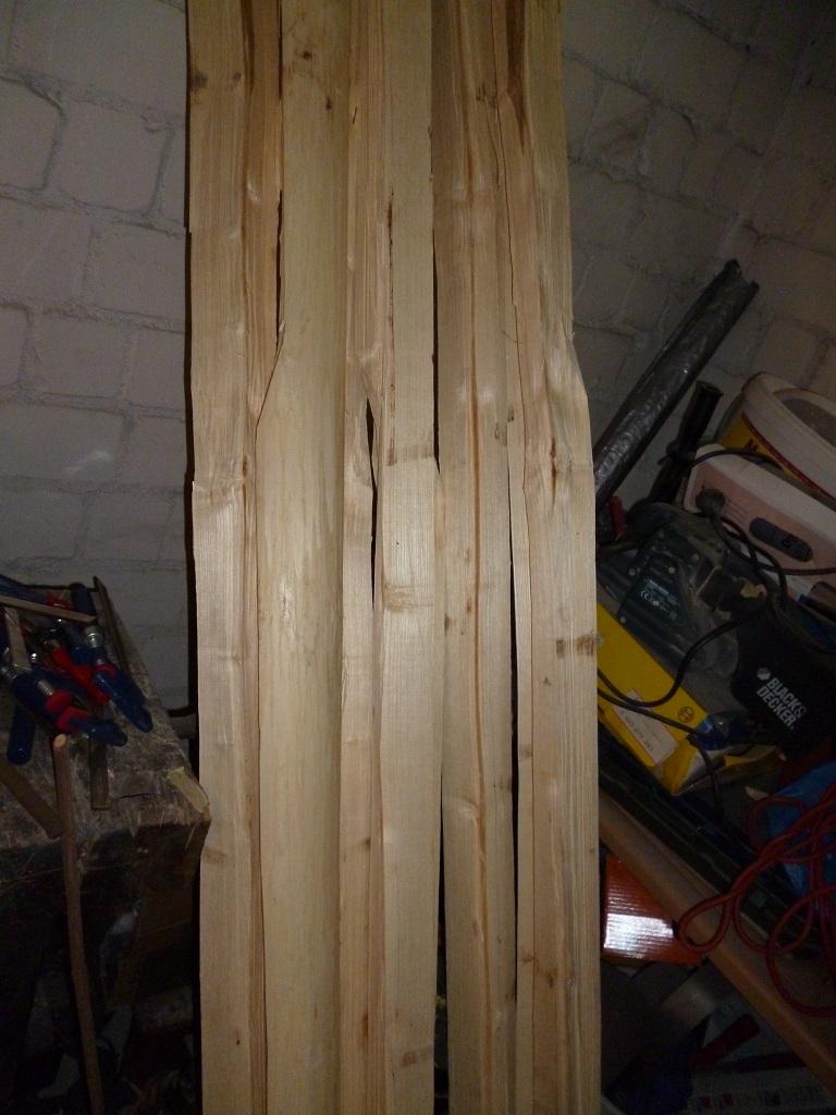 Habe in 6 Teile gespalten, entrindet und jetzt liegt sie mit weiß gestrichenem Rücken und Stirnseiten im Keller. Mal sehen ob da ein Bogen raus kommt, in der Not kann ich immer noch die geraden Stücken raus schneiden und spleißen.
